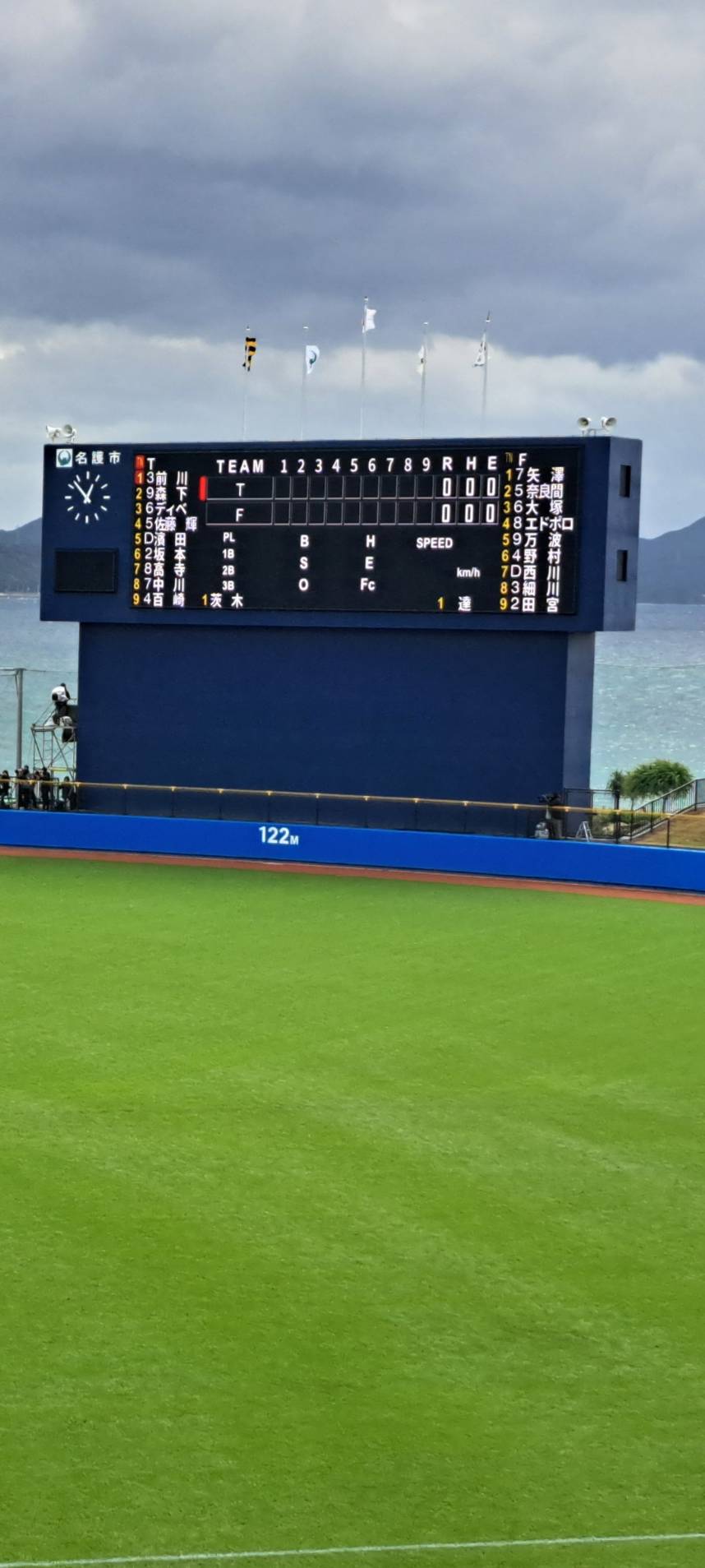 初日は、名護球場が海に近いこともあり、風が強く体感気温は、5度くらいで、たまに小雨が降ったりするので、凍えながらの観戦でした。